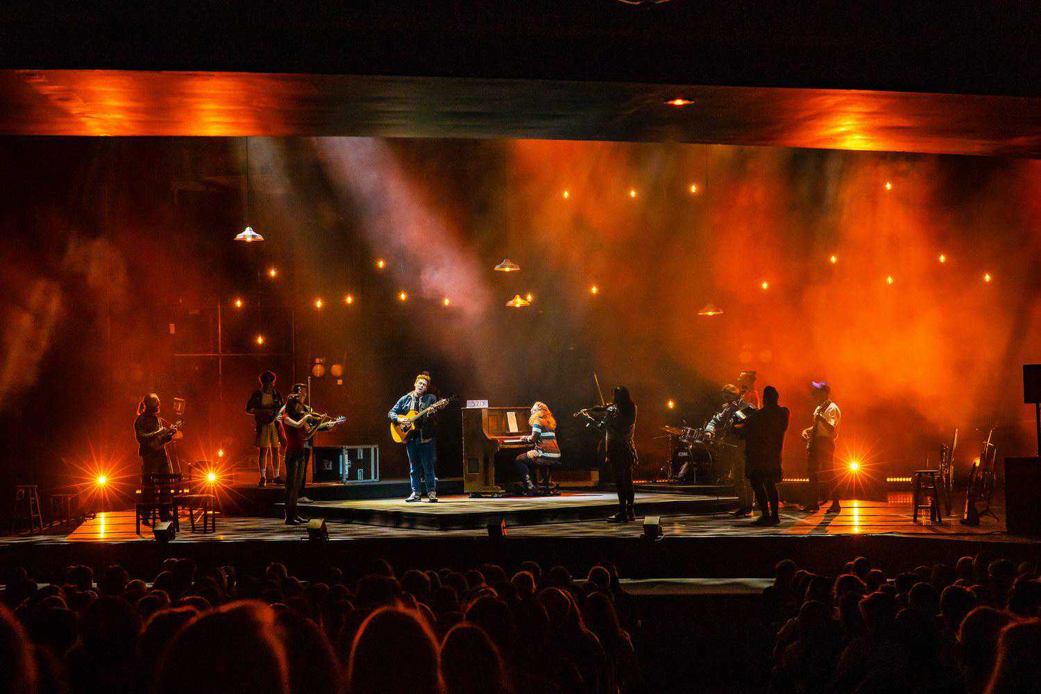 音乐剧《曾经》改编自2006年的爱尔兰同名音乐电影,许多文艺青年对电影印象深刻,其中《缓慢落下(FallingSlowly)》获得了“奥斯卡最佳原创歌曲奖”。这是一个关于爱情和音乐的故事,无论电影还是音乐剧,都有众多让人印象深刻的音乐歌曲。而音乐剧在多首传唱金曲外,剧中演员均身兼现场乐队。其中男女主演分别演奏吉他和钢琴,其他剧中角色都演奏至少一种乐器,组成了一个以弦乐为主的乐团,包括吉他、曼陀林琴、小提琴、大提琴和尤克里里,还有六角手风琴和打击乐。最终呈现的声音带有鲜明的民谣特点,从舒缓风格到动感风格,是一次观剧和音乐会的双重视听感受。