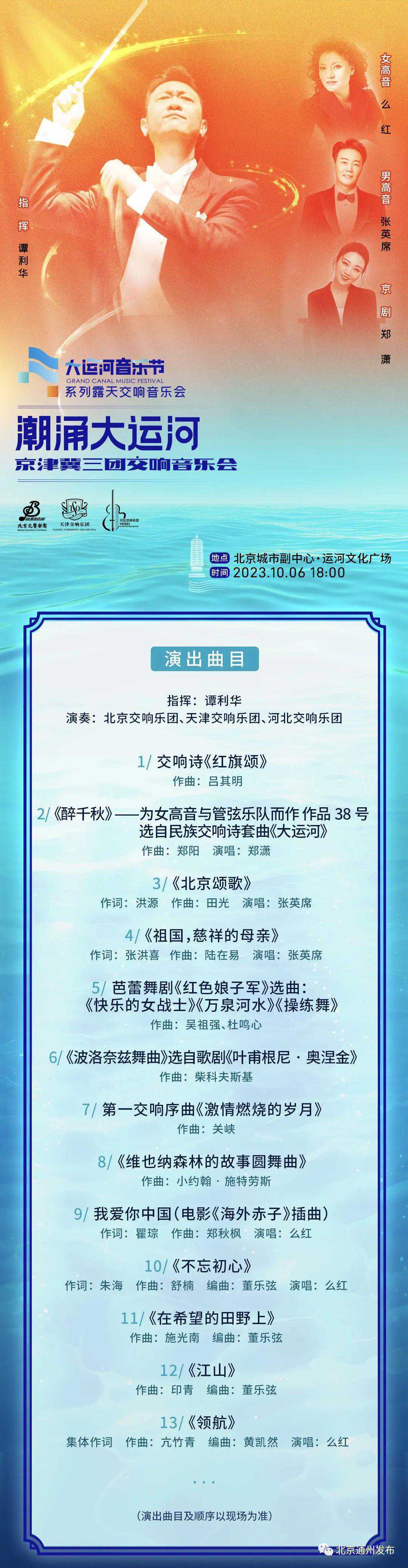 10月6日的开幕音乐会将由京津冀三地交响乐团音乐家联手打造《潮涌大运河——京津冀三团交响音乐会》,同时邀请著名指挥家谭利华、女高音歌唱家么红、男高音歌唱家张英席、京剧演员/梅派青衣郑潇等知名艺术家加盟。在纵深推进京津冀协同发展的时代背景下,以音乐之名,奏响京津冀协同发展的时代凯歌。