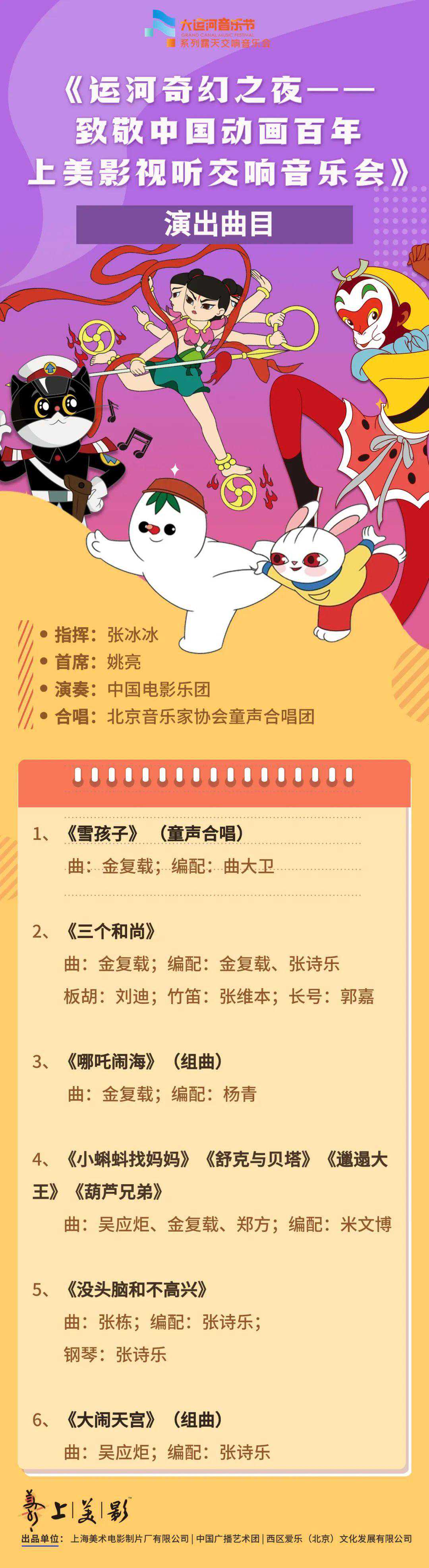 10月7日,《运河奇幻之夜——致敬中国动画百年上美影视听交响音乐会》,将用音乐带着大闹天宫、哪吒闹海、雪孩子、葫芦兄弟等经典动画形象穿越时空来到大运河畔。本场音乐会由中国电影乐团演出,现场音乐与动画配合丝丝入扣,带着观众沉浸式重温童年记忆。(相关新闻点开看)