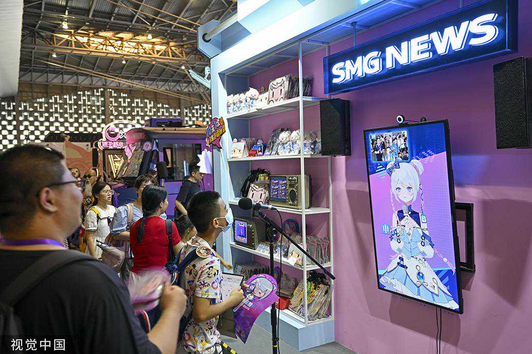 2023年7月13日,第十八届中国国际动漫游戏博览会,SMG的虚拟主播申䒕雅与观众互动。