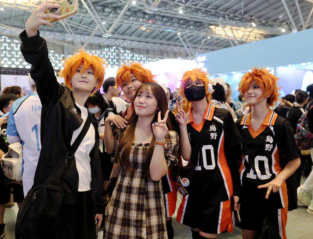 2023年7月13日,第十八届中国国际动漫游戏博览会,观众和动漫造型的角色扮演者合影。