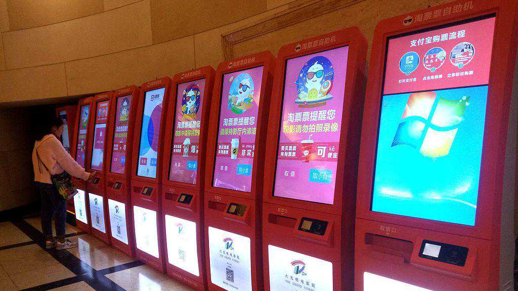 电影院里,观众使用“淘票票”自助机在淘票。