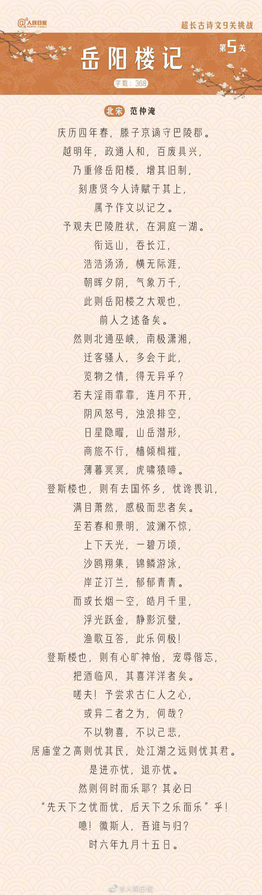 湖南岳阳楼景区,位于湖南省岳阳市岳阳楼区洞庭北路,自古有“洞庭天下水,岳阳天下楼”之美誉,与湖北武汉黄鹤楼、江西南昌滕王阁并称为“江南三大名楼”,是“中国十大历史文化名楼”、古代四大名楼之一,世称“天下第一楼”。在该景区5分钟内背完《岳阳楼记》全文,得分95分以上,可得一张门票。