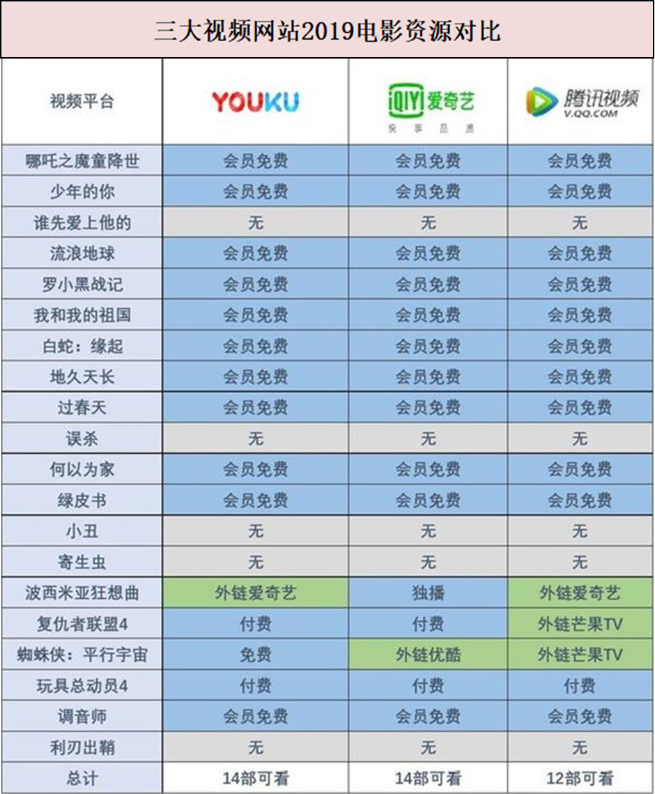 有人曾选取了2019年国内外比较热门的20部电影进行对比,在电影资源方面,爱奇艺和优酷在数量上占优,国内电影方面,三大平台基本持平。