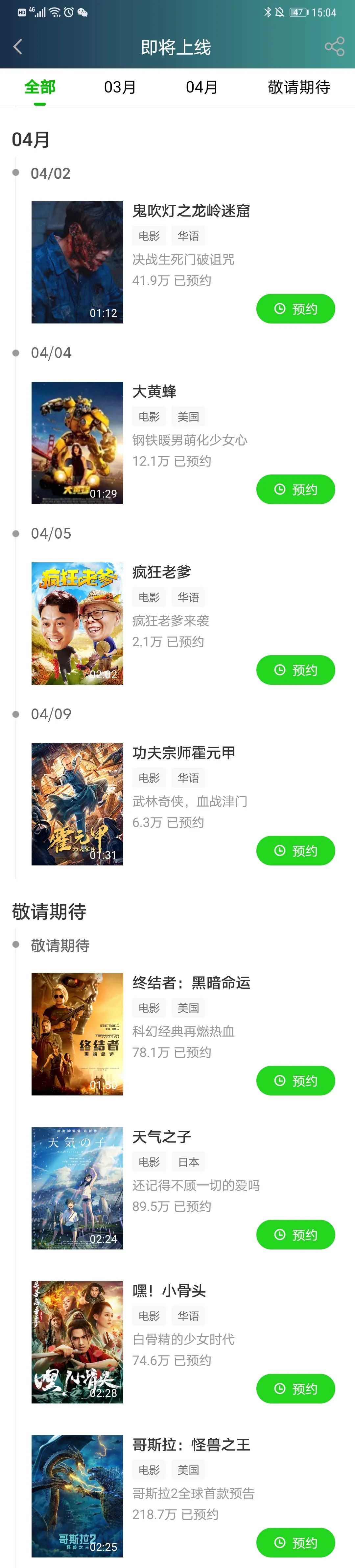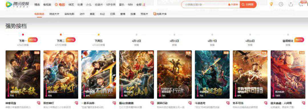 爱奇艺:近日热播电影有:《大鱼》《陈情令之乱魂》《爆裂之城》《奇门遁甲》《亚瑟王:神剑出鞘》《穿越火线》;即将上线的新电影有:《大黄蜂》(4月4日)、《疯狂老爹》(4月5日)、《功夫宗师霍元甲》(4月9日),以及即将播放的《狼鹰》《终结者:黑暗命运》《天气之子》《哥斯拉:怪兽之王》,等等。