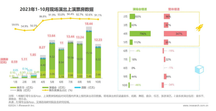 2023年的演出热能持续到2024年吗?目前已经有多位艺人官宣了2024年的演唱会巡演行程,也有不少音乐节提前预告了今年的演出计划,但2023年的演出狂热还会再现吗?从数据趋势上来看,井喷期已基本过去,2024年的演出票务市场将适当降温,回归理性。