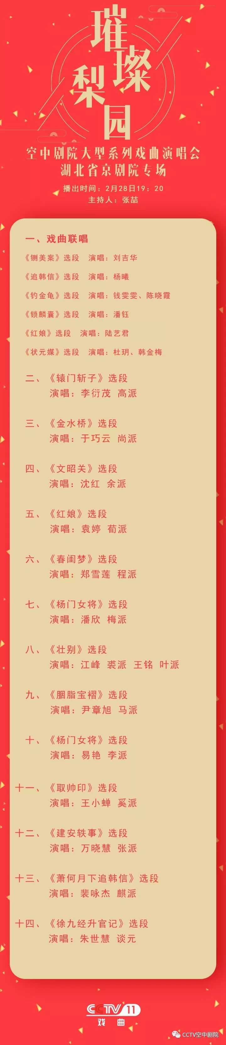 湖北作为京剧发源地之一、当代京剧“京津沪汉”的重要骨干,湖北省京剧院将于2月28日为全国戏迷倾情呈现《璀璨梨园——空中剧院大型系列戏曲演唱会》。