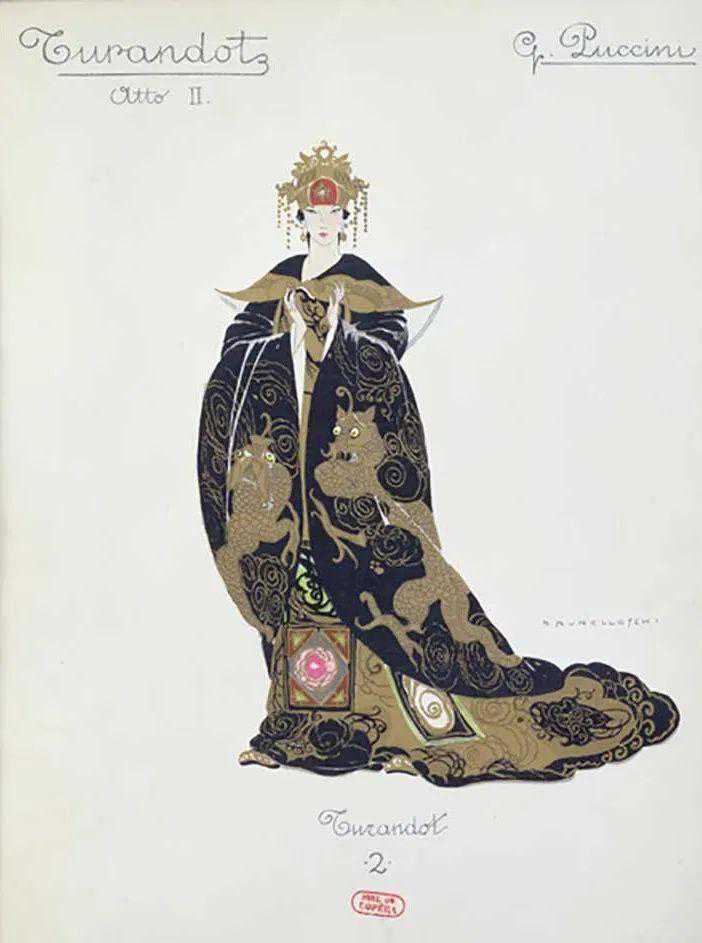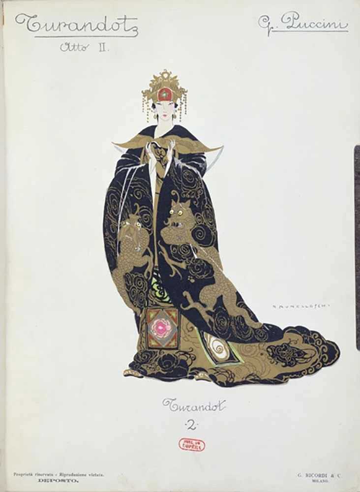 意大利著名插画大师翁贝托·布鲁内莱斯基为《图兰朵》首演设计的舞台造型:图兰朵公主,1926年