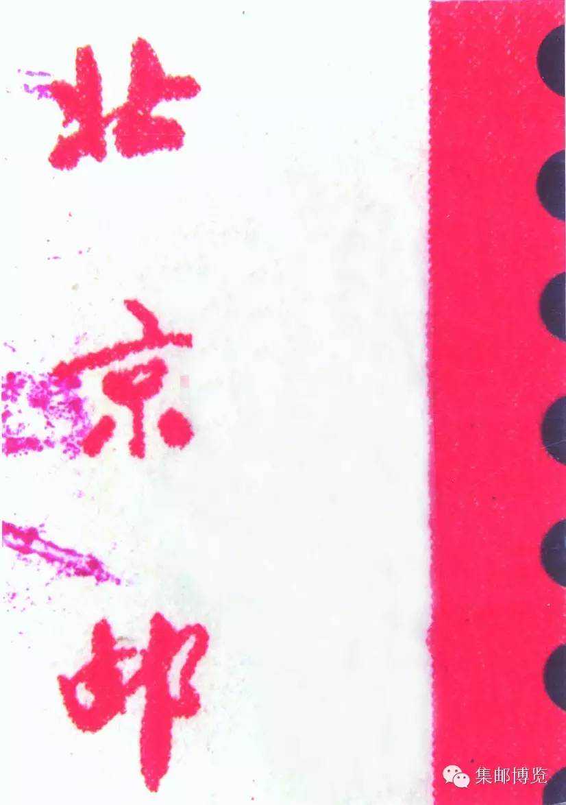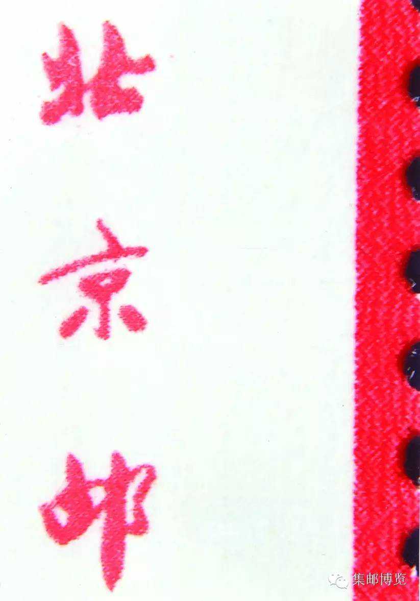 看邮票边纸上的厂铭。真品边纸上的厂铭采用红色专版印制,其影写版特征明显:网点呈圆形中空状,网纹夹角呈45°;这种伪品边纸上的厂铭则采用胶版仿影写版印制,虽与真品一样也采用红色专版印刷,但网点杂乱无章,并不呈现圆形中空状,网纹夹角混乱,用高倍放大镜仔细辨认,可看出它与真品的不同。