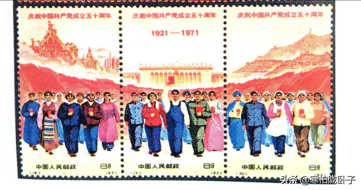 1971年7月1日是中国共产党成立五十周年,为庆祝党的生日,发行邮票1套9枚,其中编号为18—20的三枚邮票是三连票。
