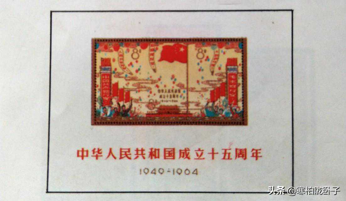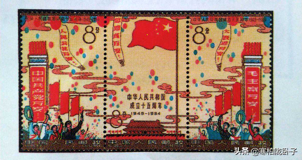 1964年10月1日纪念国庆十五周年发行的邮票就是三连张,3枚邮票组成一幅欢庆国庆节的图案。表现新中国蒸蒸日上,不断发展壮大的场景。