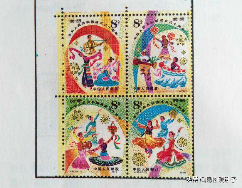 1979年10月1日国庆三十周年,发行的邮票不同于前几次纪念国庆时发行的三连票形式,而改为四方连邮票,图案为全国各族人民欢庆的场景。(❿附图如下:请欣赏⇊)