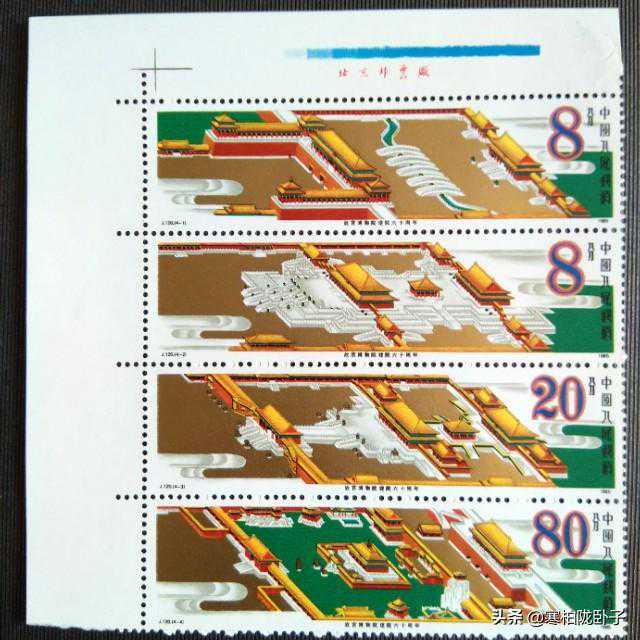 1985年10月10日故宫博物院建院六十周年之际,发行的纪念邮票就是竖四连票。4枚邮票面值不同、图案不同,分别是丹阙凌云、太和睛旭、乾坤交泰和琼花春辉。
