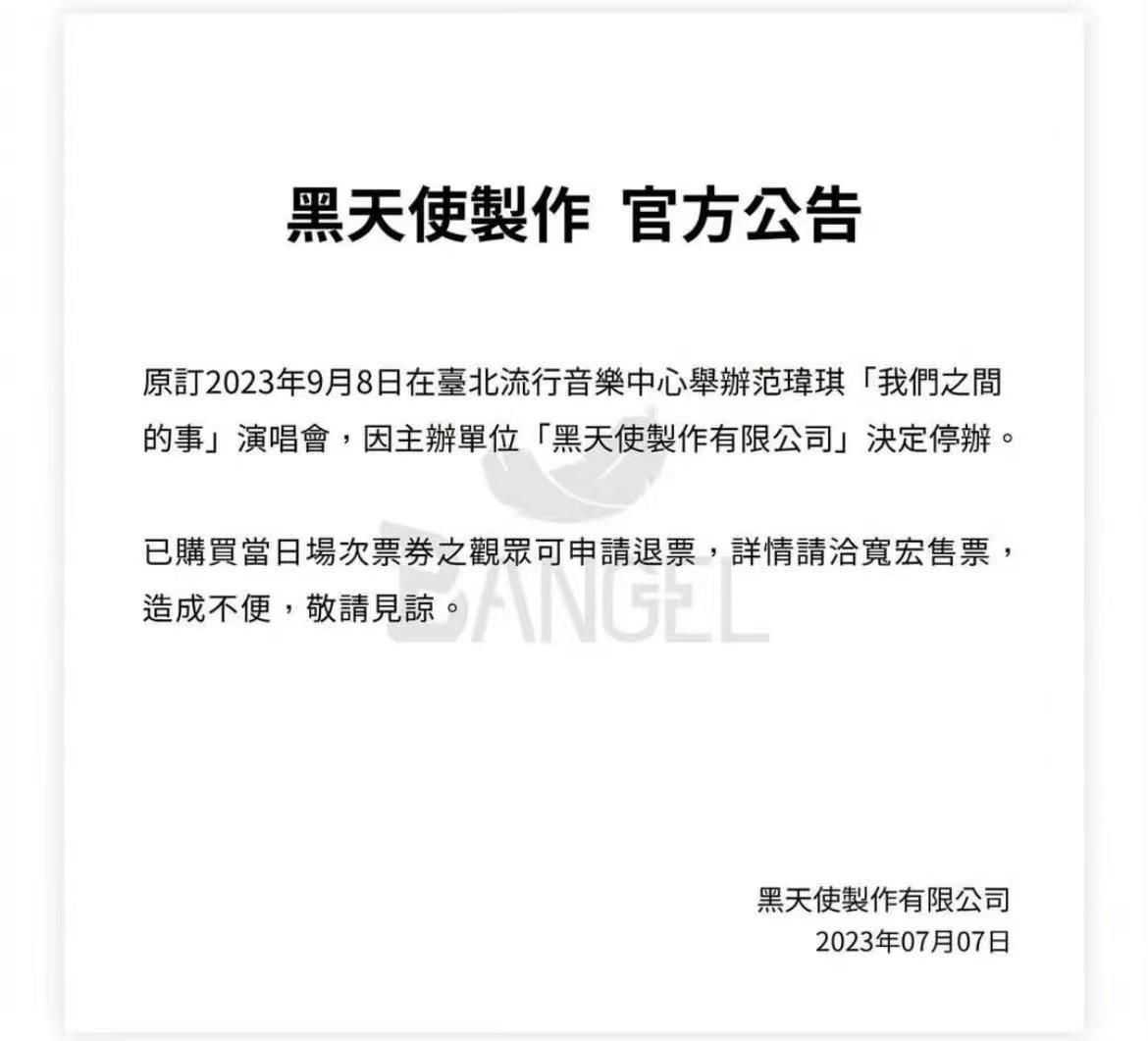 近日,黑天使制作公司官方发文,称原定于9月8日在台北流行音乐中心举办的范玮琪“我们之间的事”演唱会取消。不难看出,此次演唱会突然被取消,和前段时间陈建州被曝性骚扰女明星脱不了关系。