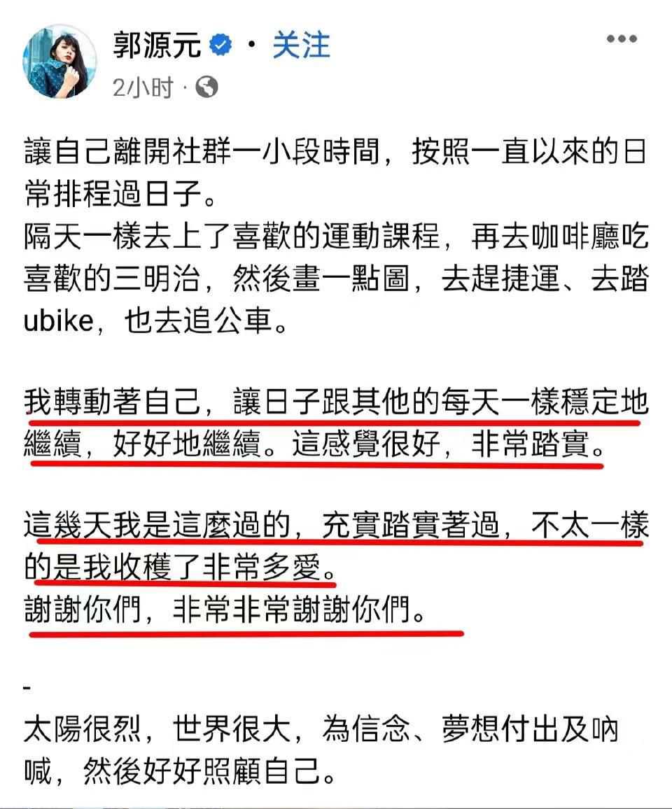 而另一位控诉人郭源元也时隔九天之后再发文分享近况,称自己这几天充实踏实过着,感谢大家的关爱。而照片中的郭源元喝咖啡,外出沐浴阳光,健身房健身等等,看得出来并没有受到陈建州的影响。