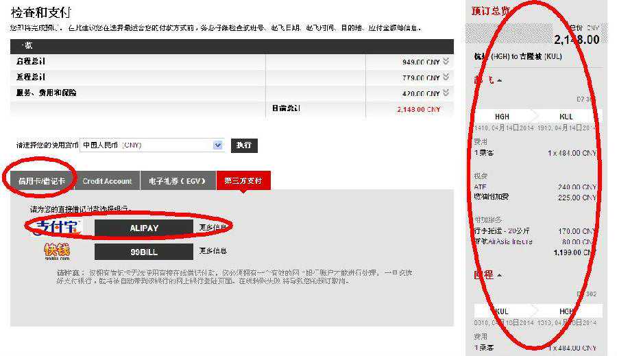 亚航的支付页面还是挺简单的,可以支付宝付款,也可以快钱付款