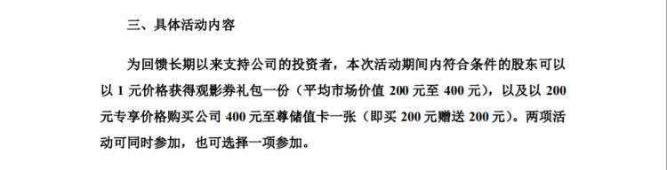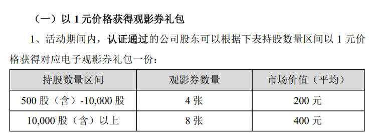据悉,活动期间内,符合条件的股东可以以1元价格获得观影券礼包一份(平均市场价值200元至400元),其中,持股500股(含)-1万股的股东可获4张观影券,持股1万股(含)以上的股东可获8张观影券。凭观影券可兑换全国任意直营万达影城2D/3D/IMAX/杜比影院制式影票1张(特殊场次及特殊影厅除外),观影券可以转赠。