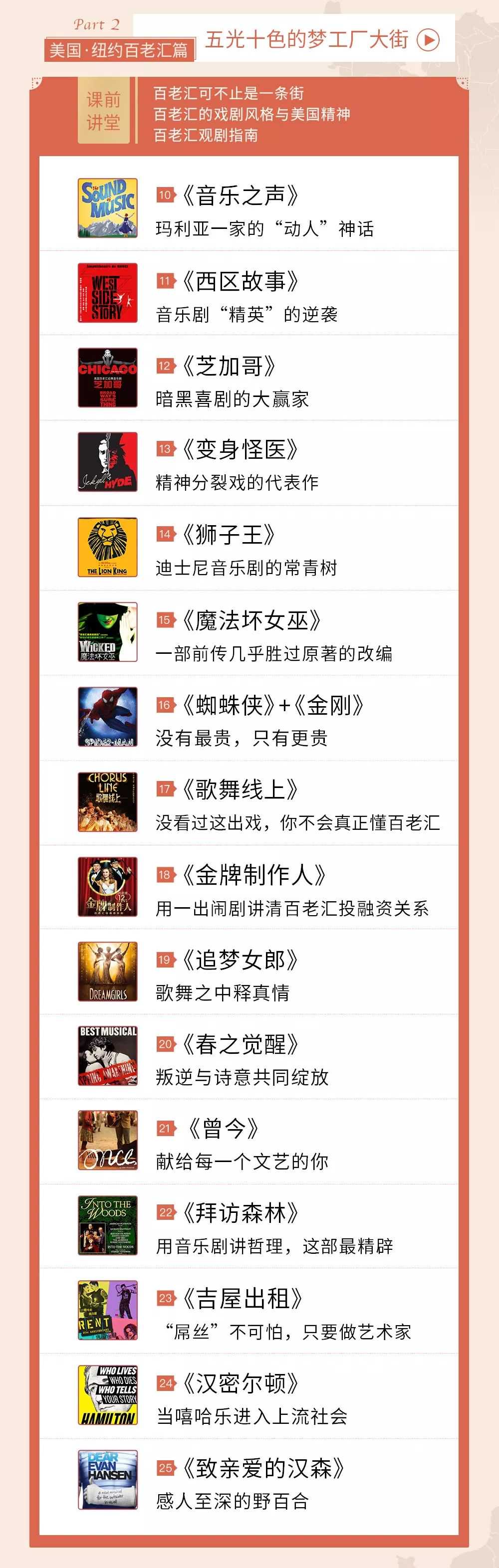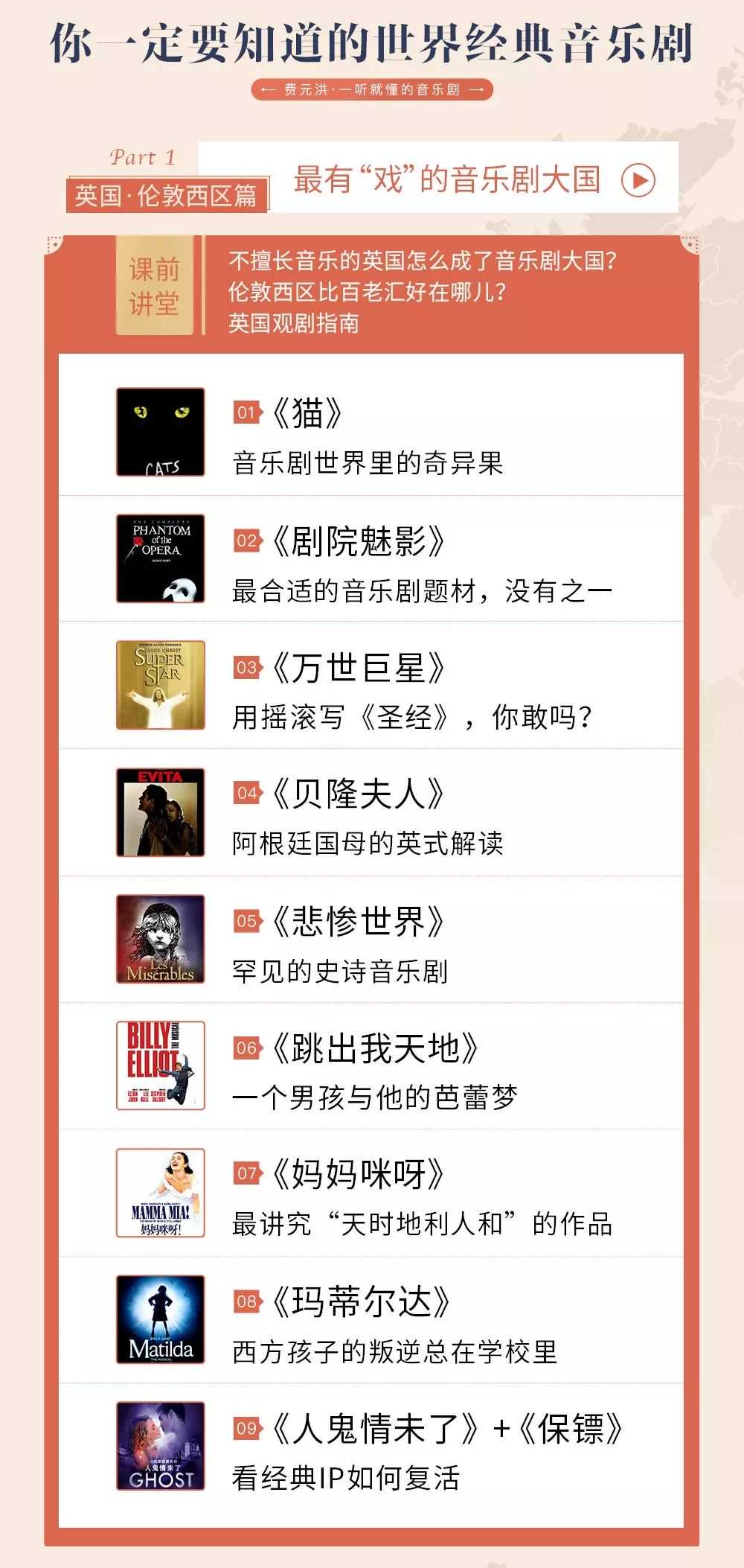 一生必看的40+部音乐剧经典,《猫》《歌剧魅影》《跳出我天地》《乱世佳人》《悲惨世界》《巴黎圣母院》……涵盖英国、美国、法国、德国、奥地利、俄国等国,包揽各大语种音乐剧,让你对全球经典如数家珍。