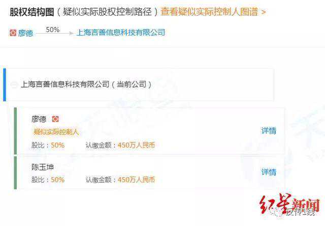 红星新闻记者看到,该公司法定代表人为陈玉坤,旗下仅有1家公司,即上海言善信息科技有限公司,该公司成立于2018年12月19日,注册资本为900万人民币,其经营状态为“存续”。经营范围包括,从事计算机科技专业领域内技术开发、咨询、服务、转让及票务代理等等。