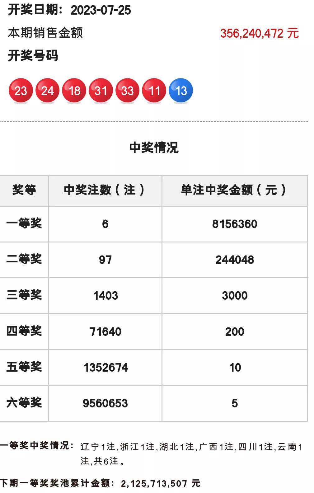 由上图可知一等奖中出6注,单注奖金815万元,二等奖中出97注,单注奖金24.40万元,三等奖中出1403注,单注奖金3000元。开奖结束后目前奖池还剩21.25亿元。