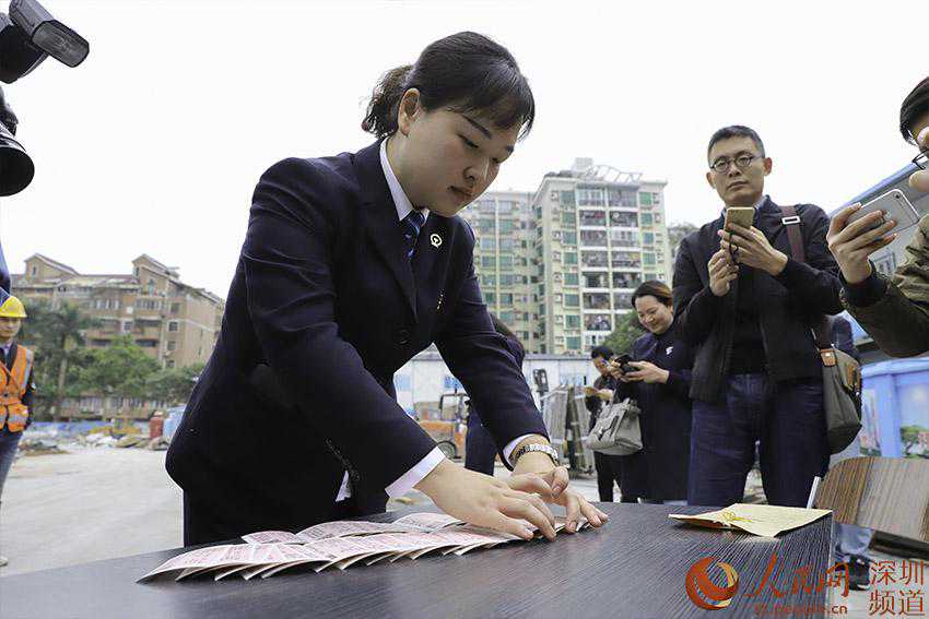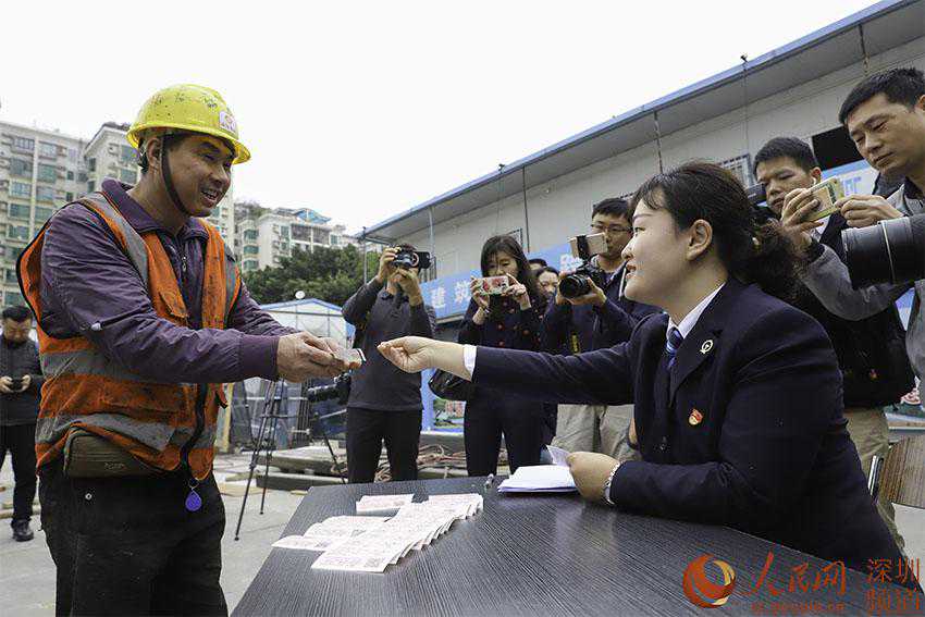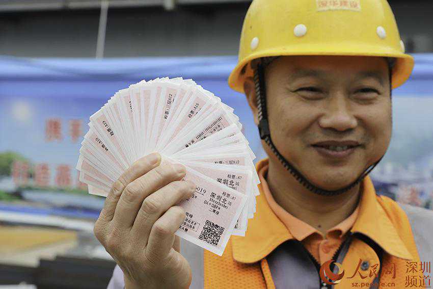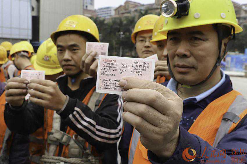 人民网深圳(吕绍刚、朱唯信)深圳火车站1月8日在南山科技园片区开展“送票进工地”活动。在汉京中心建设工地上,工人们从火车站工作人员手中接过春节回家的火车票。