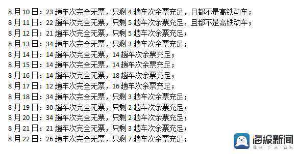 而未来14天,该路段只有中间的4天(即14日至17日),尚有十余趟车次余票充足。其他日子里,余票充足的车次均为个位数,超过20多趟车次完全无票。