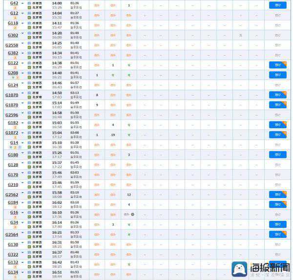 济南去北京的列车有132趟车次,62趟车次显示没有余票,26趟车次余票不足。