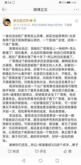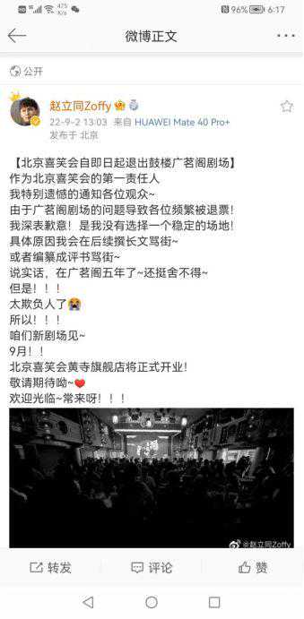赵立同手撕广茗阁的微博背后,让人看到的是中国相声人、相声团体如今发展之艰难与不易,前有场馆所限、后有生存紧逼。高昂的租金、愈发艰难的市场,检验相声成功的唯一标准是商演,喜笑会汇聚众多专业相声演员、多次创新,也用了五年才达到标准,由此可窥,中国相声人目前的处境有多艰难、坚守有多不易。